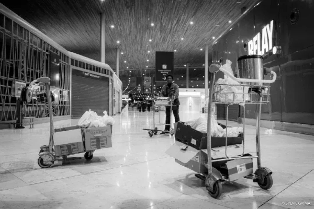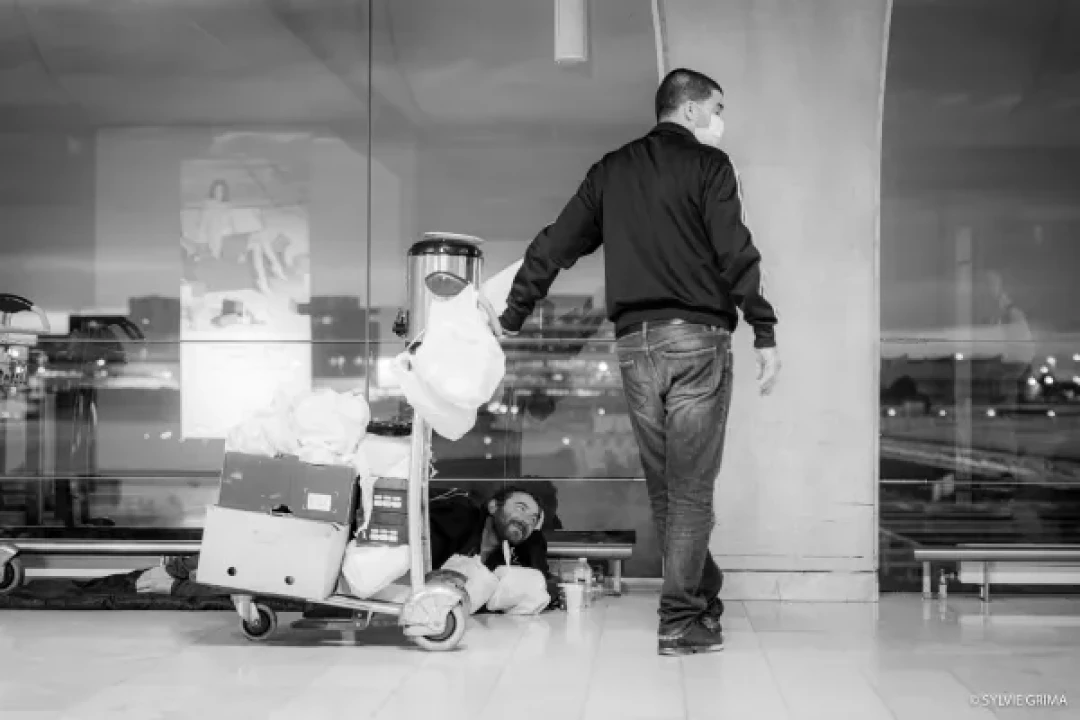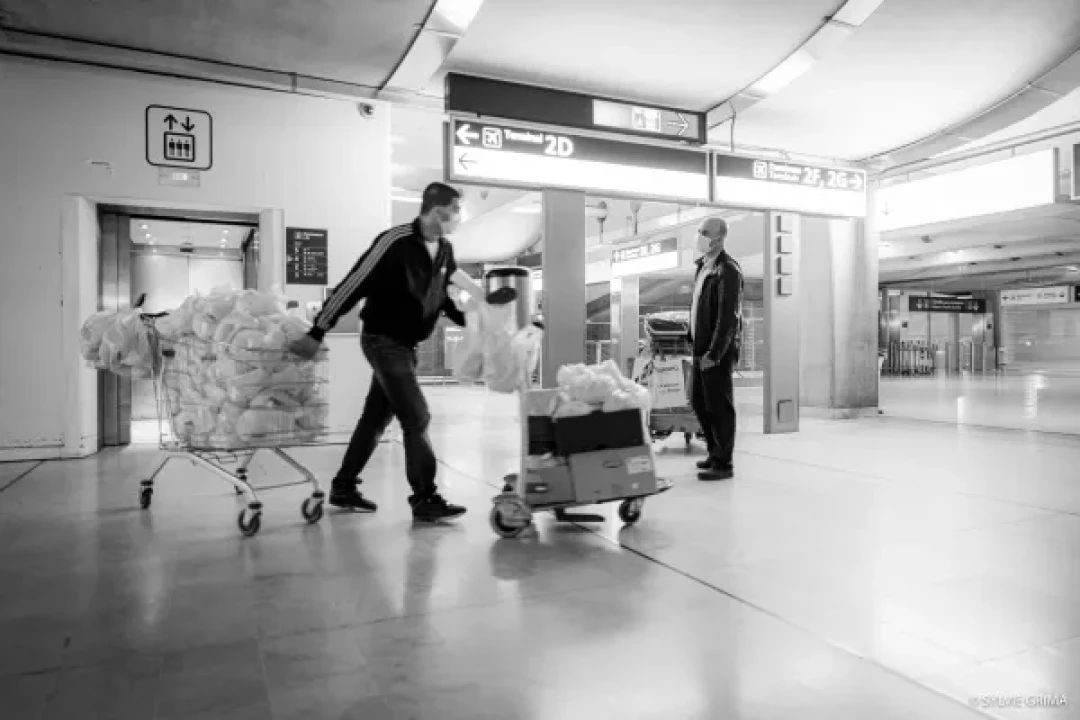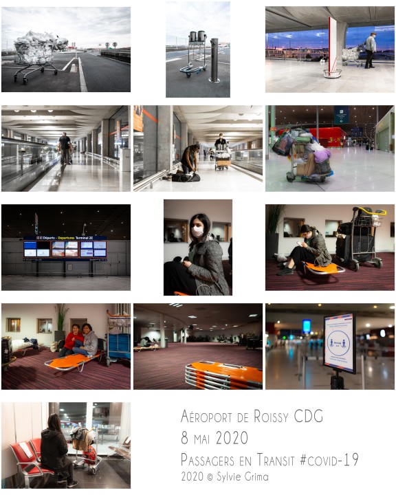 Ce reportage, construit en collaboration avec Jean-Lionel Dias, parle aussi des associations Solidarité Migrants Wilson et Chauffeurs du coeur qui passent tous les soirs, de la Gare TGV à l’aérogare 12, chariots remplis de panier repas, cafés, thé à la menthe fait maison, pour tenter d’apporter réconfort et repas chaud, à chacune des personnes confinées entre deux vols, entre deux mondes, passagers ou sans abris, sans différence."
