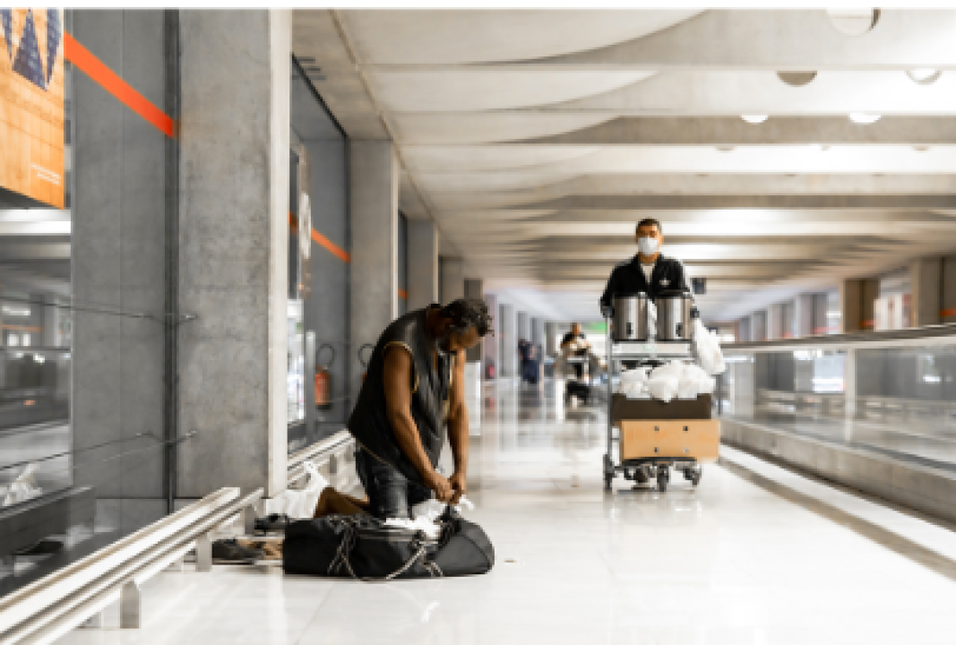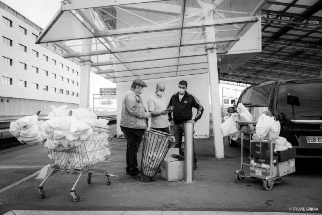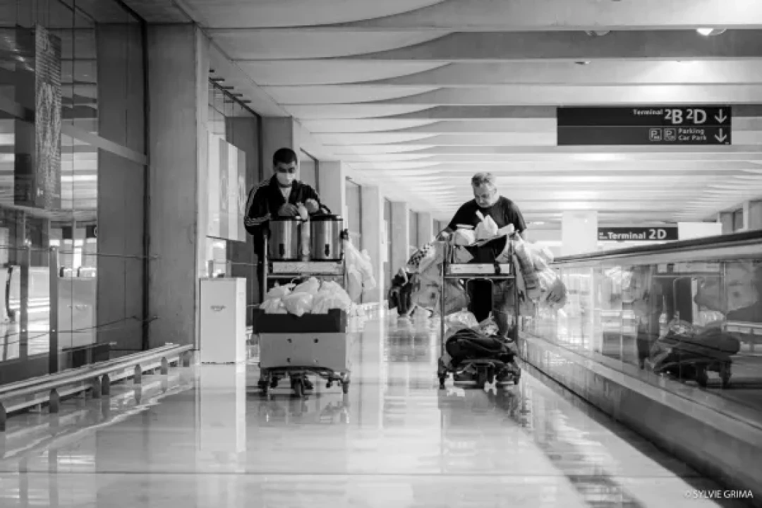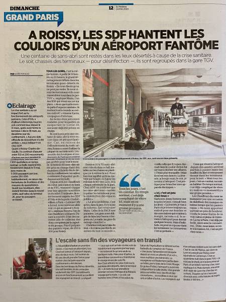 Ce reportage, construit en collaboration avec Jean-Lionel Dias, parle aussi des associations Solidarité Migrants Wilson et Chauffeurs du coeur qui passent tous les soirs, de la Gare TGV à l’aérogare 12, chariots remplis de panier repas, cafés, thé à la menthe fait maison, pour tenter d’apporter réconfort et repas chaud, à chacune des personnes confinées entre deux vols, entre deux mondes, passagers ou sans abris, sans différence."
